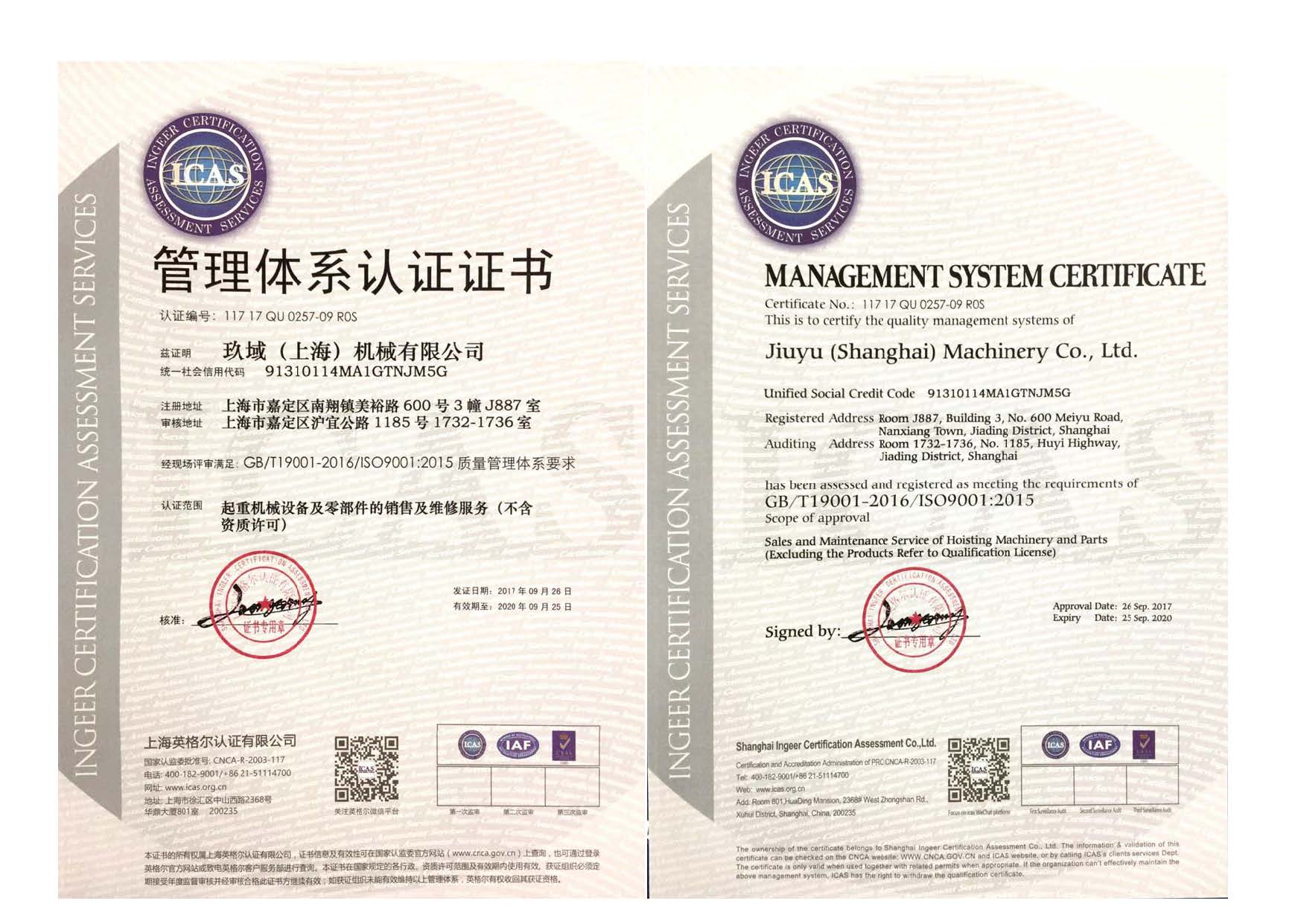 • 公司通過ISO9001:2015質量體系認證 公司于2017年9月26日順利通過英格爾認證機構ISO9001:2015質量管理體系認證!